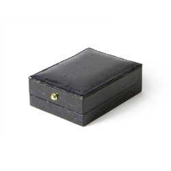 Estuche forrado imitación a piel de cocodrilo, con pespunte decorativo en la parte superior de la tapa.